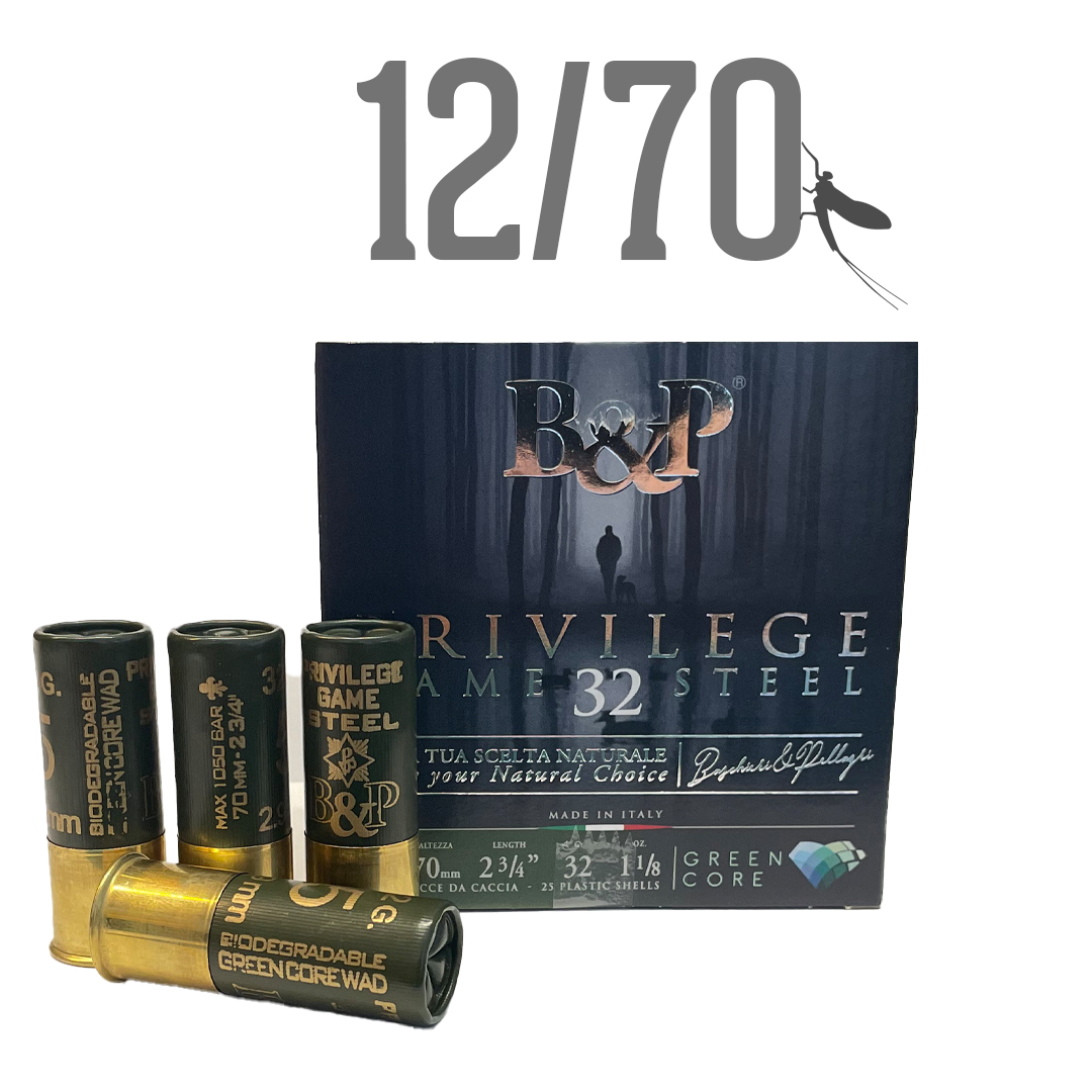12/70 B&P Privilege Game Steel 32g on yksi Baschieri & Pellagrin Green Legacy patruunoista.  Laadukas ja nopea teräspatruuna on ladattu 100% maantuvalla Green Core välitulpalla, joka tässä patruunassa on erityisesti suunniteltu suojaamaan piippua ja varmistamaan tiukat kuviot.