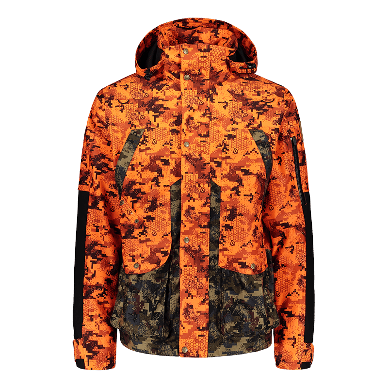Anar Hirvas M's Hunting Jacket on suomalaisen huippusuunnittelijan ja osaavan mallimestarin yhteistyön tuloksena syntynyt takki, joka ei jätä toivomisen varaa! Anar Hirvas metsästystakki on suunniteltu suomalaiseen hirvi- ja peurajahtiin. Pintamateriaali on erittäin hiljaista ja kulutusta kestävää harjattua polyesteria. Väri ja kuosit on suunniteltu maastouttamaan metsästäjä eläimen näkökyvyltä. Kirkas oranssi väritys täyttää uusimmat lain vaatimukset. Nämä ominaisuudet sopivat erittäin hyvin niin passi- kuin hiivintämetsästykseen.