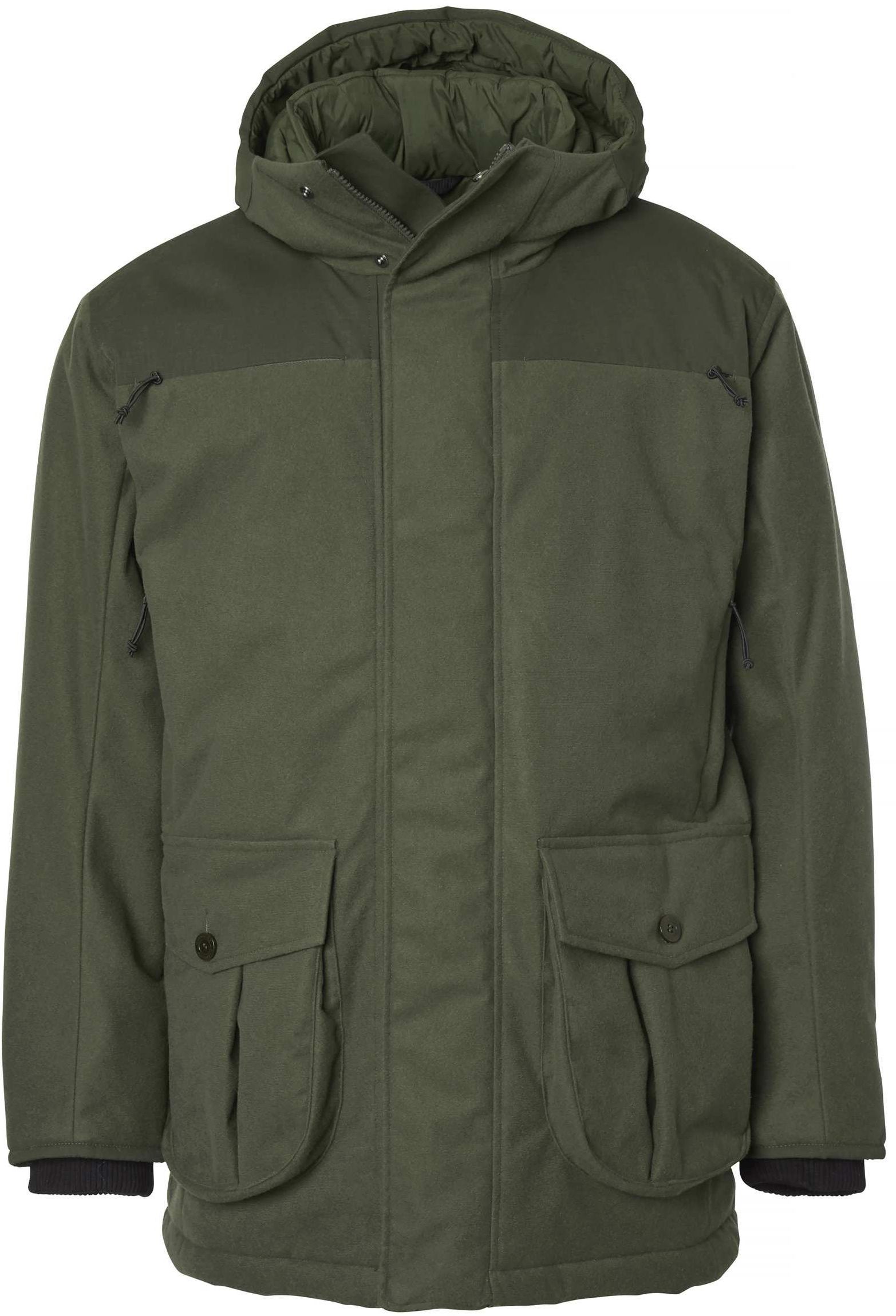 Chevalier Frost Powerfill 200 Jacket Frost-takki on lämpimin metsästystakkimme. Siinä on paksu toppaus ja se sopii kylmiin metsästyspäiviin ja passipaikalle. Takissa on pehmeä harjattu päällyskangas kierrätyspolyesteriä ja olkapäillä Cordura® Ripstop -vahvikkeet. Kaksinkertainen kaulus pitää tuulen ja kylmän loitolla ja suojaa sinua passissa istuessasi. Ulompi kaulus on erittäin korkea ja sisempi pehmeä, topattu ja hyvin peittävä. Takissa on kaksi radiotaskua, ripustustaskut, suuret paljetaskut, takatasku ja napoleontasku, jossa sisäpuolella turvatasku. Frost-takissa on edessä kaksinkertainen nappilista, jossa painonapit. Sisäpuolella irrotettavat hihnat, joiden ansiosta voit ripustaa takin repuksi olkapäille, jos sinulle tulee liian kuuma. Erityisen hieno yksityiskohta on istuinlappu, joka on kiinnitetty sisäpuolella ja jonka voit taittaa alas. Siihen voit laittaa istuinalustasi. Takissa on säädettävä vyötärö. Frost-takki ja -housut muodostavat yhdessä lämpimimmän ja monikäyttöisen metsästyspuvun.