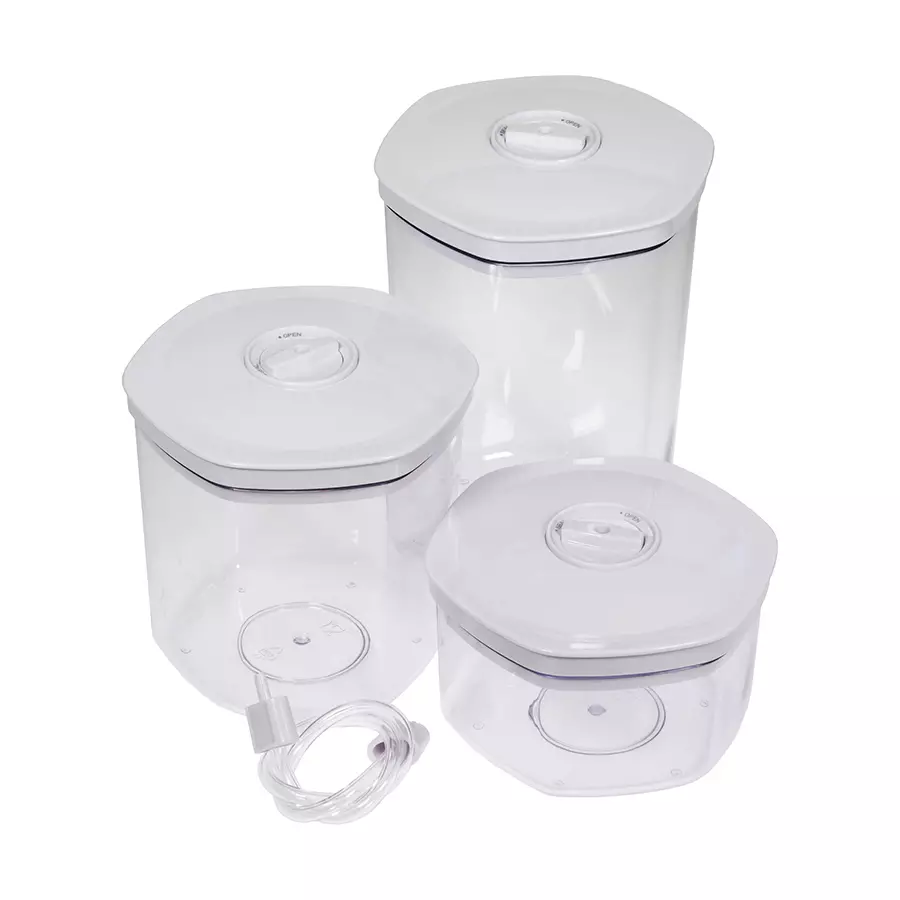 Finnvacuum Vakuumiastiasarja 3-osainen on suunniteltu erityisesti käytettäväksi Finnvacumin tyhjiöpakkaajien kanssa. Sarja sisältää kolme erikokoista säiliötä: 700 ml, 1400 ml ja 2000 ml. Settiin kuuluu myös yleinen imuletku. Astiat ovat ihanteellisia kuivatuotteiden, nesteiden ja keittojen säilytykseen jääkaapissa. Ne ovat myös erittäin käytännöllisiä lihan, siipikarjan ja kalan nopeaan marinointiin tyhjiön avulla, mikä mahdollistaa marinoinnin tehostumisen muutamassa minuutissa. Säiliöt kestävät konepesun, mutta niiden kansi ei.
