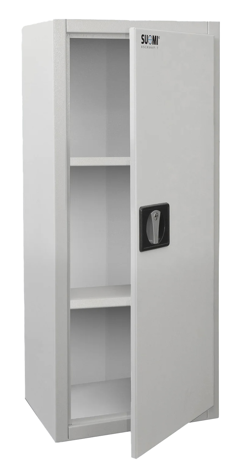 Suomi Ammo L patruunakaappi on tarkoitettu ampuma-aseiden patruunoiden säilyttämiseen. Suomen aselaki velvoittaa aseenomistajaa säilyttämään patruunat lukitussa kaapissa. Lukittava Ammo L -patruunakaappi on valmistettu 1,5 - 2 mm pellistä ja siinä on kiinnitysreiät lokeron kiinnittämistä varten. Myös kiinnitysruuvit sisältyvät toimitukseen. Kaapissa on kaksi välihyllytasoa, joiden jako on säädettävissä. Pinnat on viimeistelty valkoiseksi (RAL 9010) pulverimaalauksella.