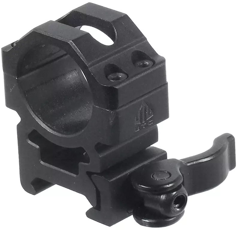 UTG 1" Picatinny Scope Rings QD Lever Lock on kiikarinjalka, joka on valmistettu lentokonealumiinista ja viimeistelty mustalla anodisoinnilla. Siinä on ergonominen ja säädettävä pikalukitusvipu, joka sopii kaikkiin Picatinny-kiskoihin.