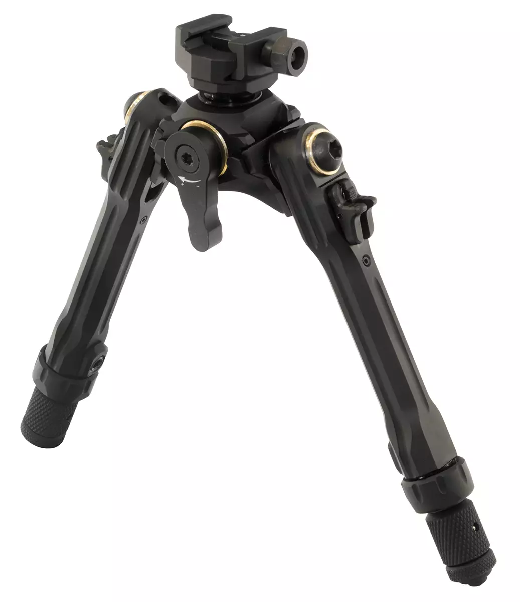 Tuki kiinnittyy matalaprofiiliseen Picatinny-kiskoon ja mahdollistaa 360° kääntymisen sekä kallistuksen eri suuntiin. Jalat ovat automaattisesti sisäänvedettävät ja niissä on vaihdettavat jalustat.