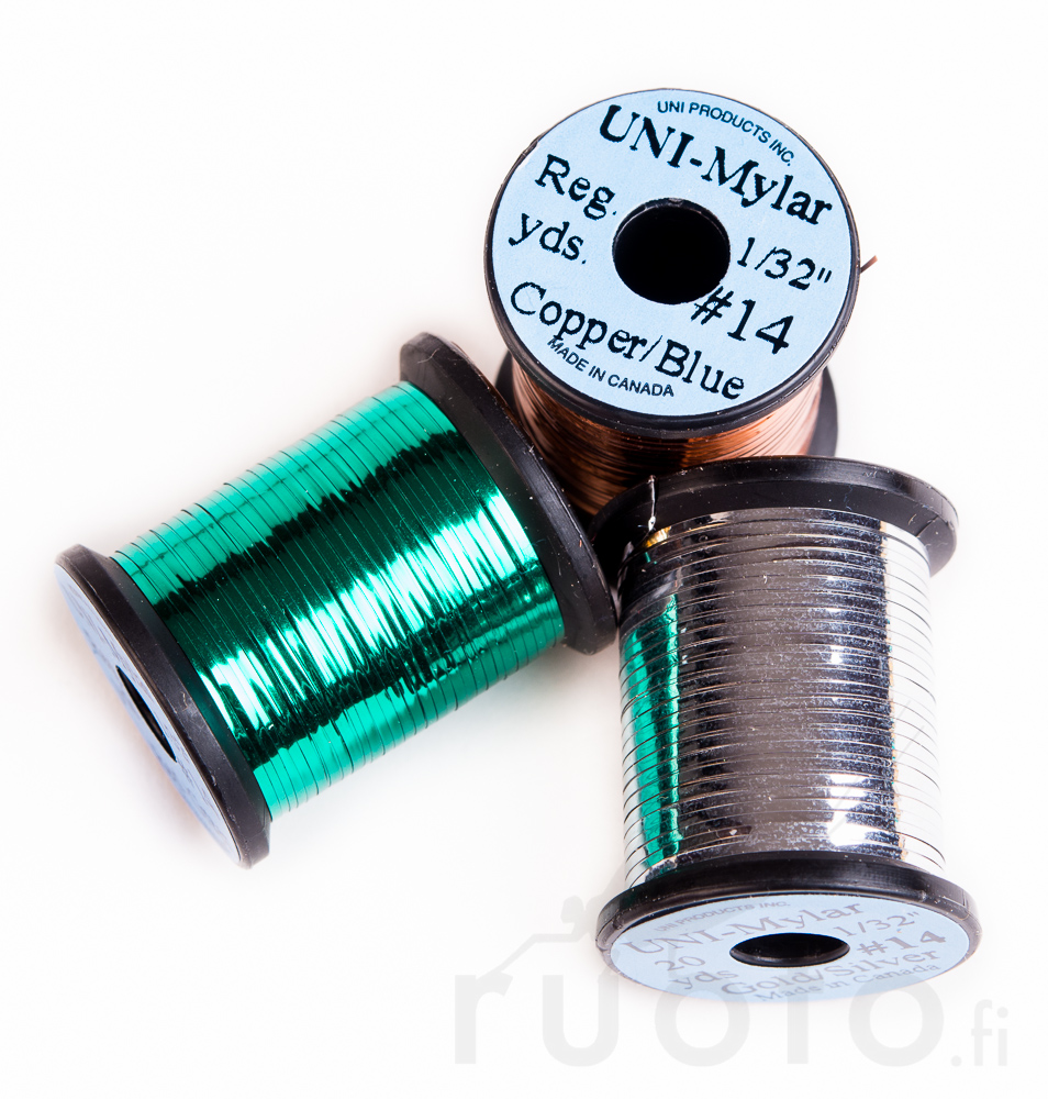UNI-Mylar on muovista valmistettu litteä runko-/kierremateriaali. Se ei missään vaiheessa tummu käytössä ja täten huolella sitomasi perhot ovat pitkäikäisiä. Useat UNI-Mylar värit ovat kaksipuoleisia, jossa toinen puoli on erivärinen kuin toinen.