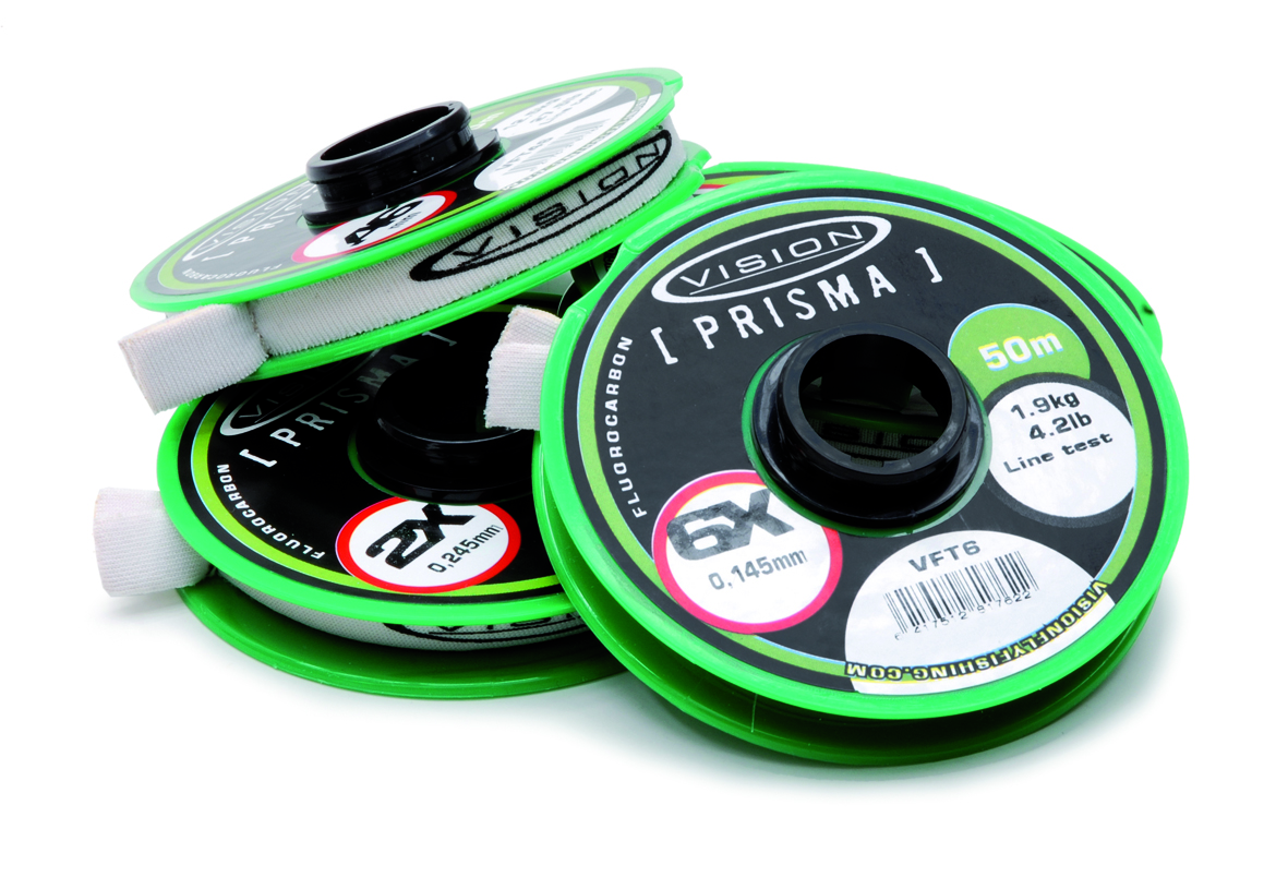 Vision Pisma Fluorocarbon - perukemateriaalilla on erinomainen solmukestävyys ja sitä on helppo solmia erityisen pinnoitteen ja hiukan normaalia suuremman venyvyyden ansiosta. Se on kuitenkin jäykkää materiaalia ja oikenee siten hyvin jos käytät raskaita painotettuja perhoja. Flurocarbonin tiheydestä johtuen se uppoaa ja on siten erityisen sovelias uppoperhojen kanssa käytettäväksi. Prisma, kuten kaikki muutkin Visionin perukemateriaalit, tulee värikoodatuissa, toisiinsa lukittuvissa ja pyörivissä helppokäyttöisissä puolissa.