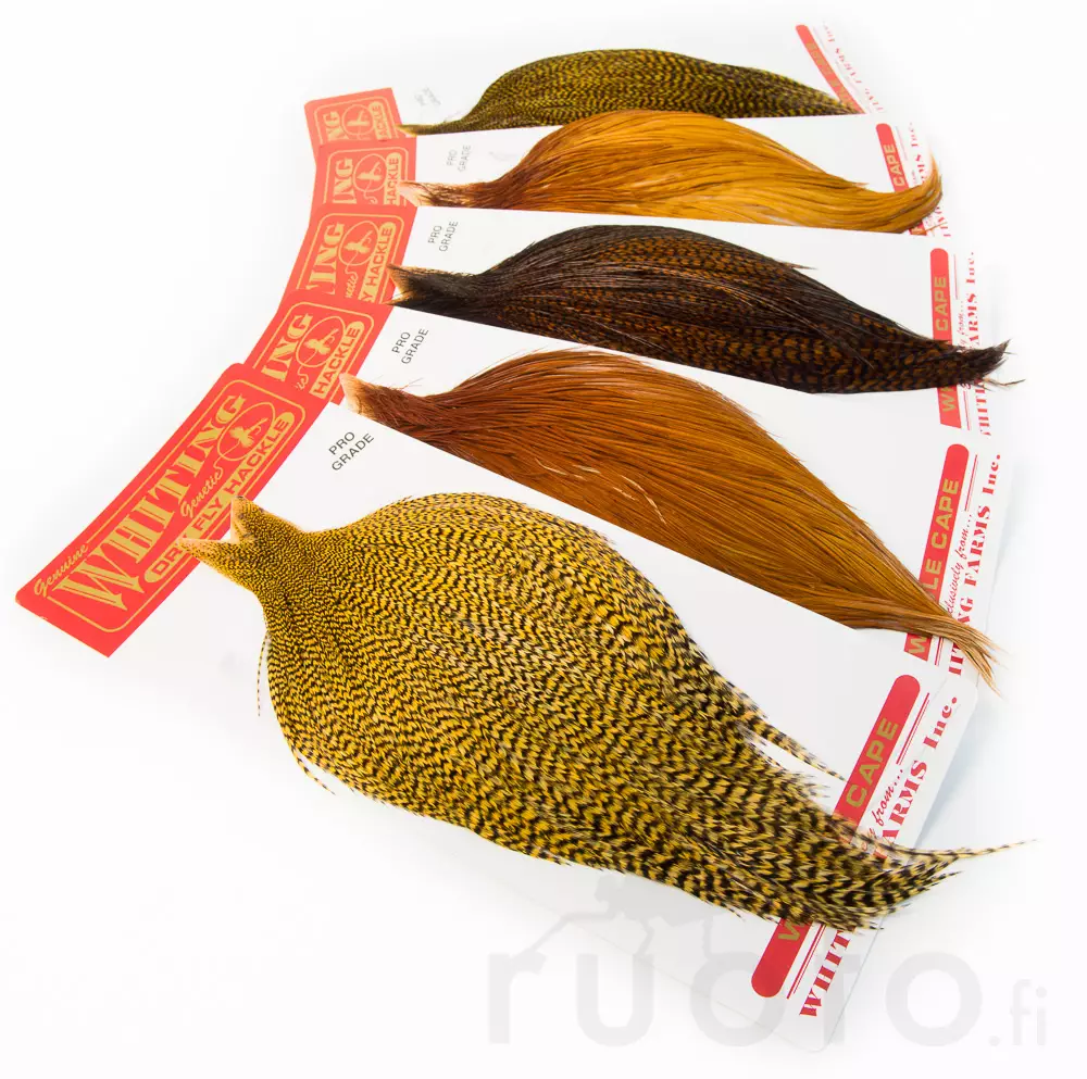 Whiting Dry Fly Cape Bronze Grade kukon niskat ovat huippulaatuisia pintaperhoniskoja joiden höyhenissä on taipuisa ja kestävä ruoto. Höyhenen siikaset hylkivät hyvin vettä, jolloin useita valeheittoja ei tarvita, vaan perho on nopeasti kuiva. Bronze grade niskassa on höyheniä 10-16 kokoluokan perhoihin.