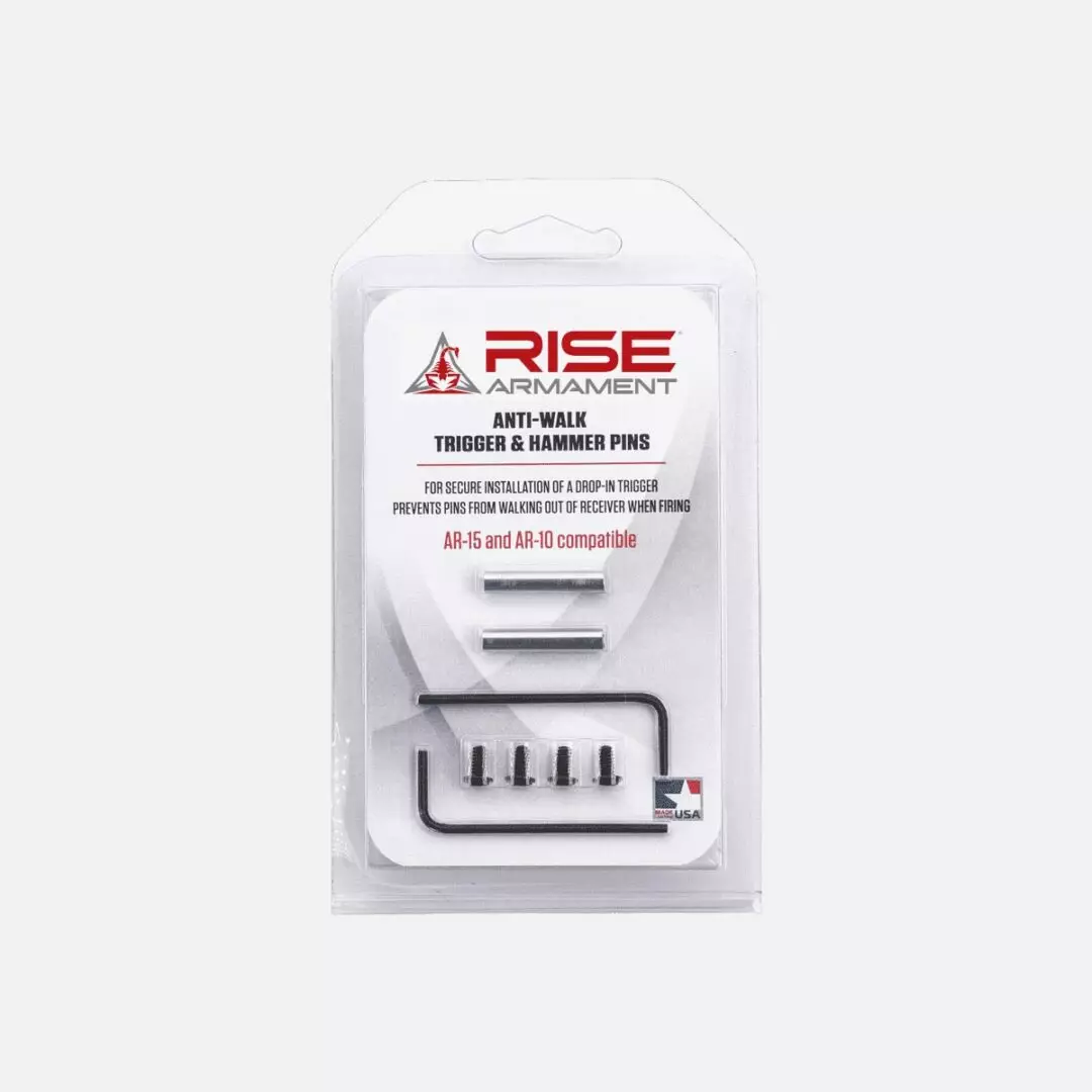 Rise Armament Anti-Walk Pins - varaosasetti, joka lukitsee AR-tyyppisten vastaanottimien trigger pins ja hammer pins -tappien paikan. Anti-walk trigger & hammer pins -ratkaisu varmistaa drop-in trigger -moduulin tukevan asennuksen ja vähentää tavanomaisten tappien taipumusta "walk out" ajan myötä, mikä parantaa kokonaisuuden toimintavarmuutta.