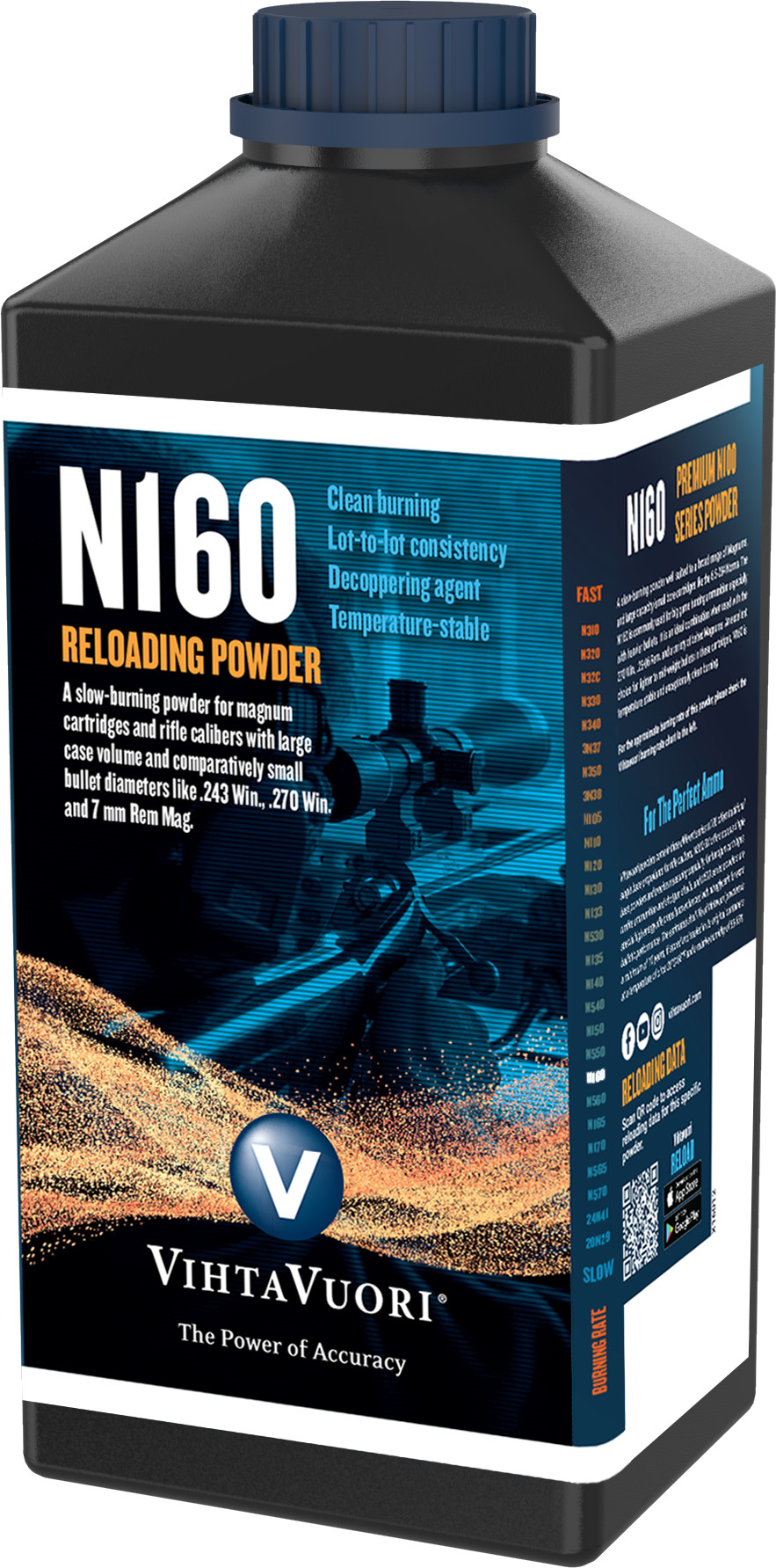 Ladataan tiedostolistaa...Vihtavuori N160 savuton ruuti 1 kg pakkauksessa. Suomalaiset Vihtavuori-ruudit ovat puhtaasti palavia, lämpötilastabiileja ja tasalaatuisia. Vihtavuoren ruudeilla suomalaiset metsästäjät ovat ladanneet tarkkoja patruunoita jo vuosikymmenten ajan! Nämä N100-sarjan ruudit ovat tarkoitettu lähinnä kiväärikaliipereihin. Vihtavuoren latausoppaasta löydät kaiken tarvittavat tiedon oikean ruudin valitsemiseen (katso alla oleva video).