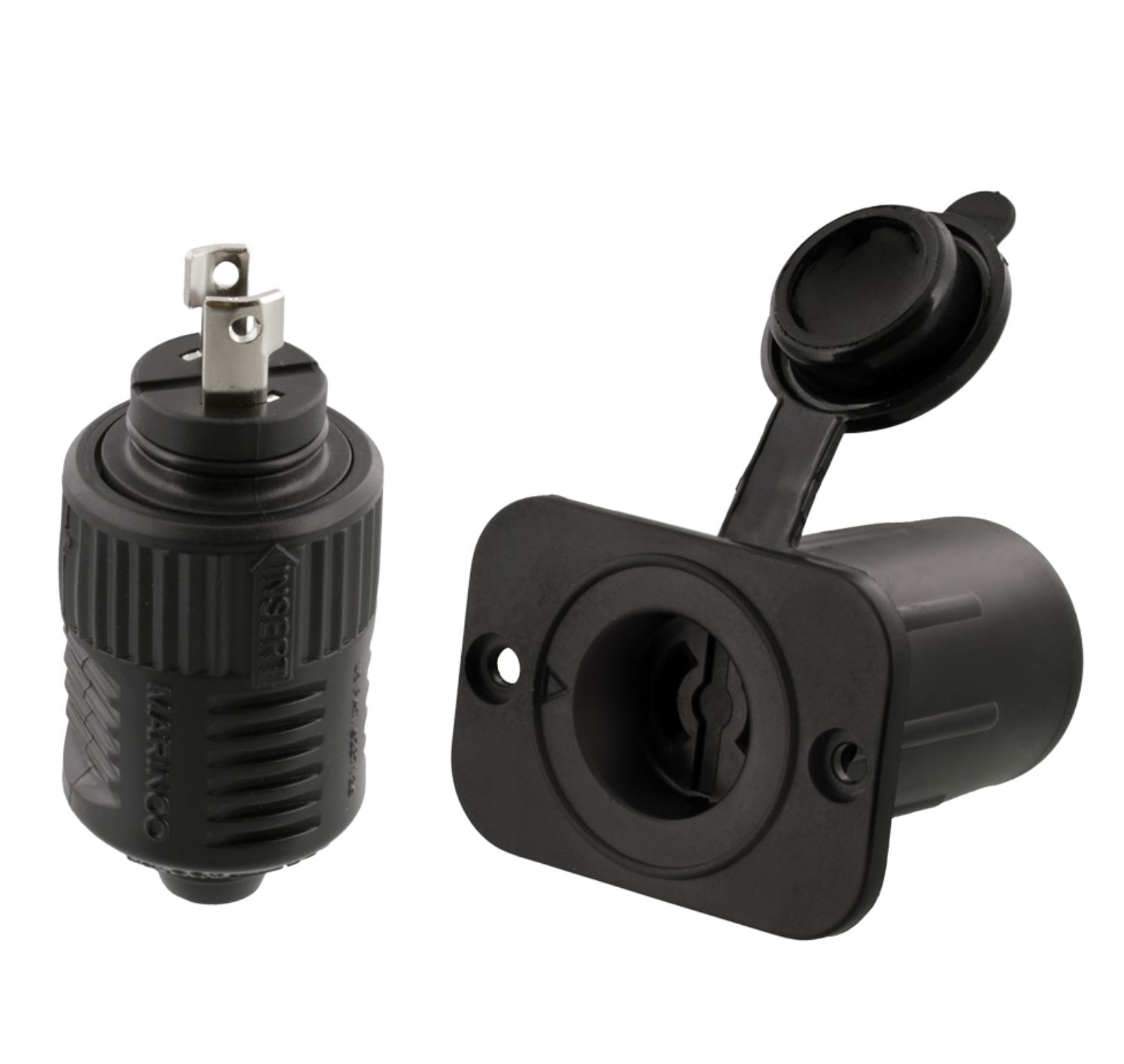Scotty 12V Power Plug and Receptacle - on erittäin laadukas Marincon tuottama 12v virtapistoke joka on suunniteltu käytettäväksi keulasähkömoottoreiden, sähkömoottoreiden sekäsähkötakiloiden kanssa. Vesitiivis naarasosa suojaa komponentteja sekä liitoksia ja siron muotoilun ansiosta istuu hyvin veneen sisustukseen. Patentoitu Marincon ConnectPro liitäntä takaa erittäin hyvän kontaktin sähköosien kesken, jotta hukkasähkön osuus olisi mahdollisimman pieni ja jotta uros- ja naarasosa pysyvät kiinni kovemmassakin kelissä.