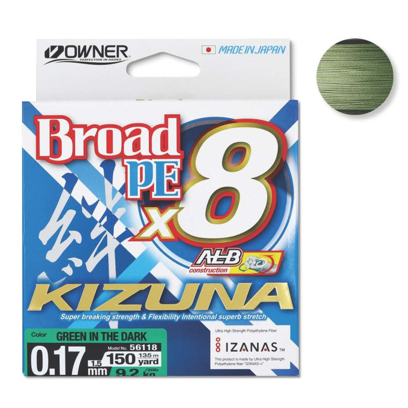 Owner Kizuna Green kuitusiima on mullistava , Japanissa valmistettu 8-säikeinen PE kuitusiima. Jos vaadit siimaltasi enemmän on Owner Kizuna sinun siimasi. Loistava vetolujuus ja todelliset siimapaksuudet. Erinomainen siima niin avo- kuin hyrräkelalle.