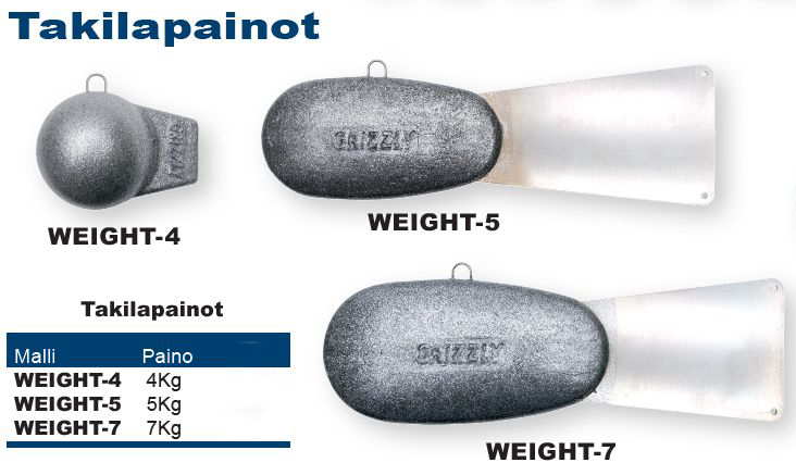 Scotty Grizzly Takilapaino on saatavilla eri painoluokissa, jotka on muotoiltu parantamaan vakautta vedessä. 4 kg paino on pyöreä, kun taas 5 kg ja 7 kg painot ovat litteitä ja varustettu perälevyllä, mikä lisää niiden vakautta ja suorituskykyä.