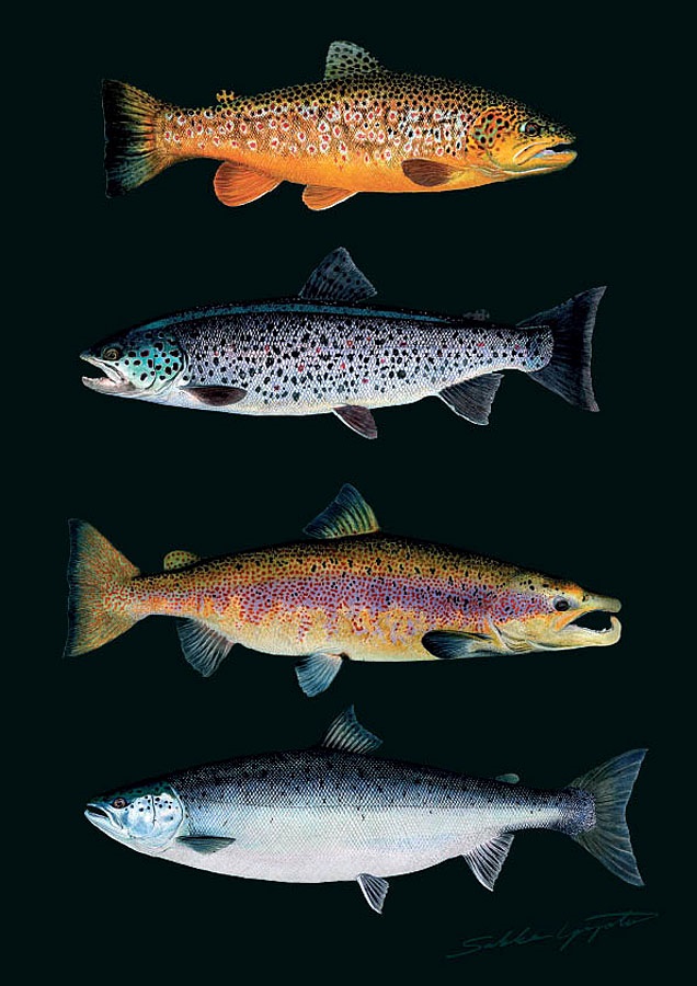 Sakke Yrjölä Lohi vs taimen -kortti/A4-kalataulu