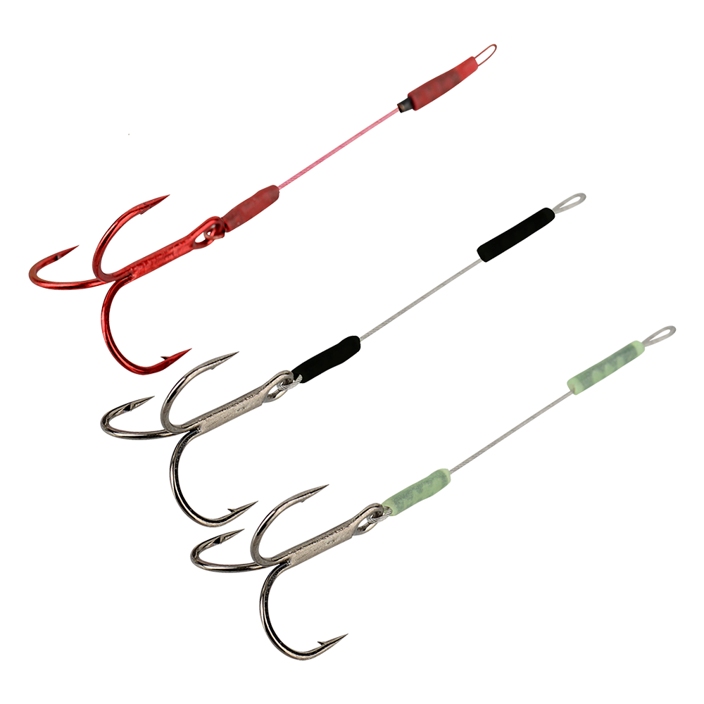Savage Gear Carbon49 Stinger -lisäkoukut toimitetaan 3kpl pakkauksissa, jossa on punainen, vihreä ja musta koukku, jotka kaikki soveltuvat hyvin eri väristen jigien kanssa käytettäväksi joko mahdollisimman huomaamattomana, tai ärsykkeenä.